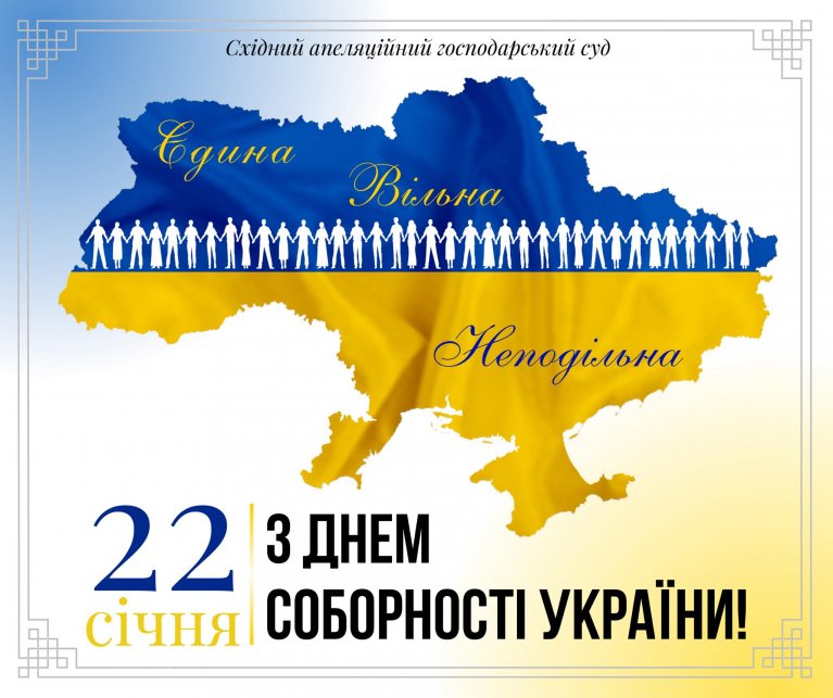 Від імені колективу Східного апеляційного господарського суду щиро вітаю з Днем Соборності України – святом єдності українського народу, неподільності нашої держави та спільної відповідальності за її майбутнє.