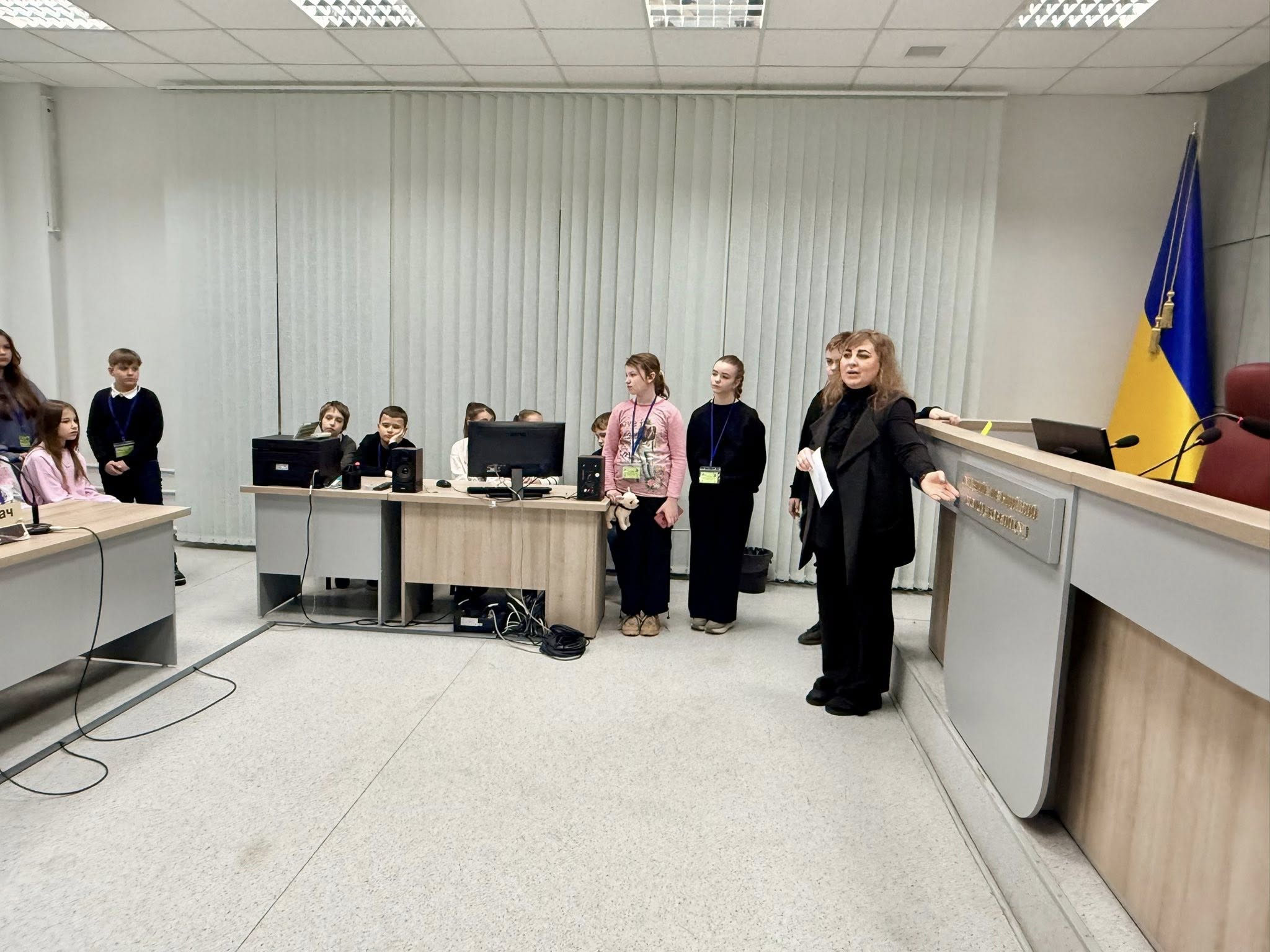 З перших хвилин перебування у суді діти відчули себе справжніми учасниками судового процесу – кожен отримав бейдж «Учасник дитячого правового клубу “Справедливці”», а на вході гостей привітно зустріли співробітники Служби судової охорони.